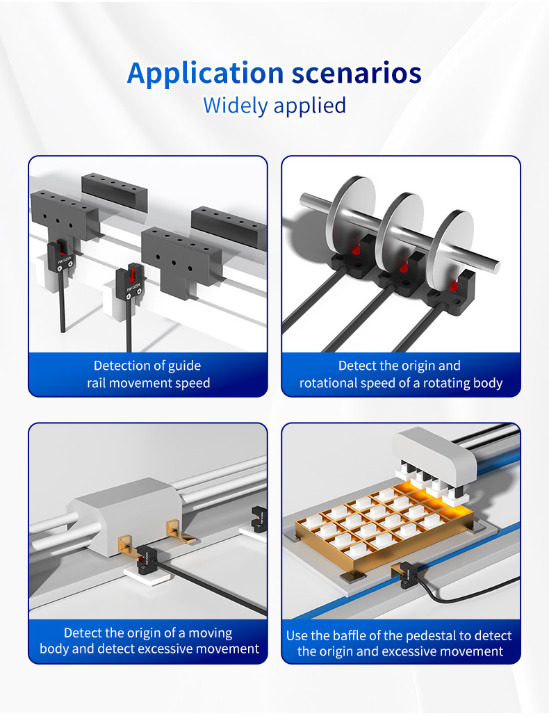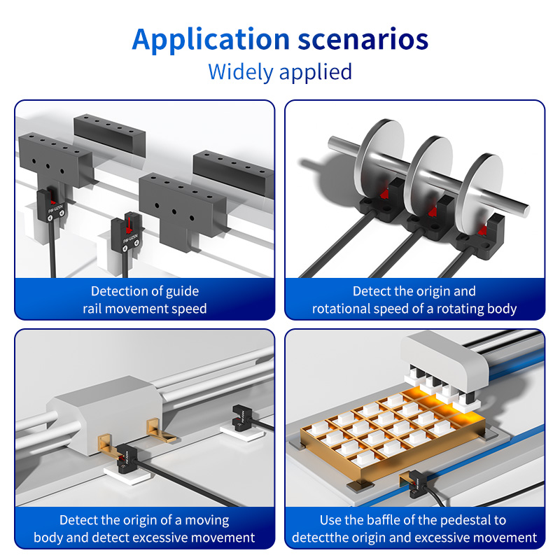 Tính linh hoạt của cảm biến rãnh chữ U FW25 khiến nó trở thành bộ phận được sử dụng trong nhiều ngành công nghiệp, bao gồm đóng gói, xử lý vật liệu, gia công CNC và tự động hóa lắp ráp. Phát hiện tốc độ di chuyển của ray dẫn hướng: Trong các hệ thống chuyển động tuyến tính, một lá cờ gắn trên xe đang chuyển động có thể đi qua rãnh chữ U. Bằng cách đếm các xung theo thời gian, FW25 có thể tính toán chính xác tốc độ tuyến tính của ray dẫn hướng, cho phép giám sát và kiểm soát tốc độ. Phát hiện nguồn gốc và hành trình quá mức của vật thể chuyển động: Cảm biến hoàn toàn phù hợp với trình tự dẫn đường. Một tab trên bộ truyền động tuyến tính hoặc cánh tay robot đi qua rãnh, cung cấp tín hiệu "nhà" hoặc "gốc" chính xác cho bộ điều khiển. Ngoài ra, cảm biến thứ hai có thể được đặt ở cuối hành trình để phát hiện hành trình quá mức, ngăn ngừa hư hỏng cơ học và đảm bảo an toàn khi vận hành. Phát hiện nguồn gốc và tốc độ quay của Thân quay: Gắn một mấu đơn hoặc bánh xe nhiều răng trên trục quay. Khi mỗi tab đi qua rãnh 5 mm, FW25 sẽ tạo ra một xung. Một xung trên mỗi vòng quay cung cấp dữ liệu gốc, trong khi nhiều xung cho phép tính toán tốc độ quay (RPM) chính xác, cần thiết cho việc điều khiển động cơ và giám sát quá trình. Sử dụng với Vách ngăn Giá đỡ để Định vị: Nhiều hệ thống sử dụng vách ngăn cố định, đơn giản. FW25 có thể được ghép nối với giá đỡ hoặc thiết bị cố định tùy chỉnh để phát hiện sự hiện diện hoặc vị trí của các vách ngăn này, tạo ra một hệ thống chuyển đổi giới hạn đơn giản và tiết kiệm chi phí.