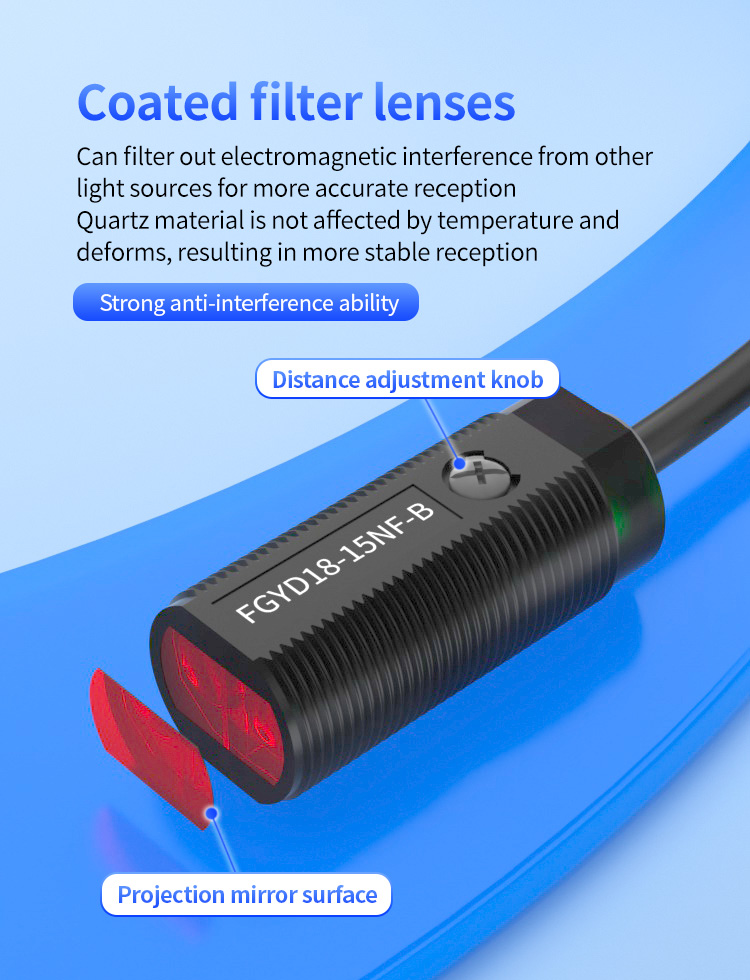 Mặt trước của cảm biến có ống kính bộ lọc được phủ, lọc hiệu quả sự can thiệp của ánh sáng và điện từ từ môi trường, đảm bảo nhận tín hiệu chính xác và ổn định. Được chế tác từ vật liệu thạch anh, ống kính chống lại nhiệt độ cao và biến dạng, duy trì hiệu suất vượt trội ngay cả trong môi trường có biến động nhiệt độ đáng kể. Thiết kế này tăng cường hơn nữa độ tin cậy của các cảm biến phát hiện máy lò xo trong điều kiện vận hành khắc nghiệt.