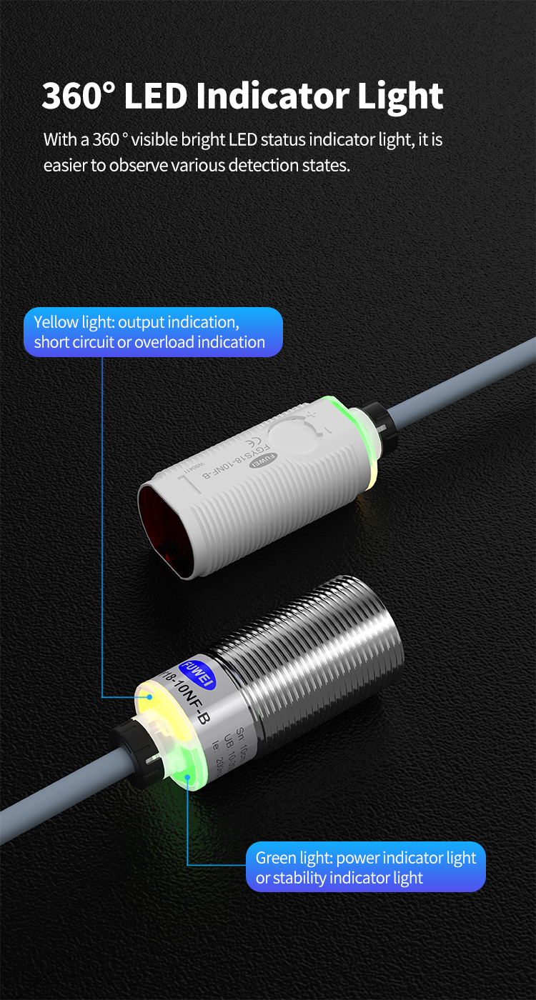 FGY18-10NU-B có chỉ báo trạng thái LED có thể nhìn thấy 360 °. Các nhà khai thác có thể dễ dàng theo dõi trạng thái hoạt động của cảm biến từ mọi góc độ. Thiết kế này tạo điều kiện thuận lợi cho việc giám sát và gỡ lỗi thời gian thực cho các nhà khai thác máy CNC, giảm thời gian chết gây ra bởi các chỉ số trạng thái không rõ ràng và tăng hiệu quả sản xuất.