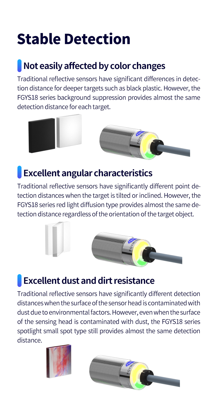 Các cảm biến truyền thống thường không phát hiện các đối tượng do các biến thể màu sắc hoặc vật liệu. FGY18-10NU-B sử dụng thiết kế quang học tiên tiến để đạt được sự phát hiện ổn định các vật thể bất kể màu sắc hay vật liệu. Cho dù phát hiện các bộ phận kim loại, phôi nhựa hoặc vật liệu màu tối trong quá trình gia công CNC, nó vẫn duy trì độ nhạy nhất quán, đảm bảo các quy trình sản xuất liền mạch và chính xác.