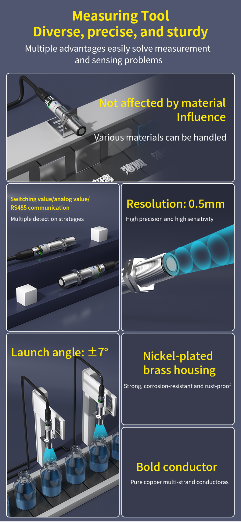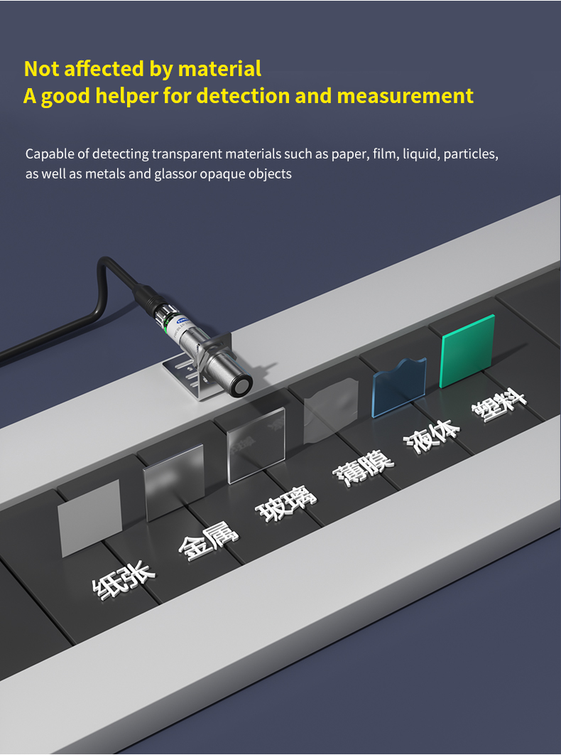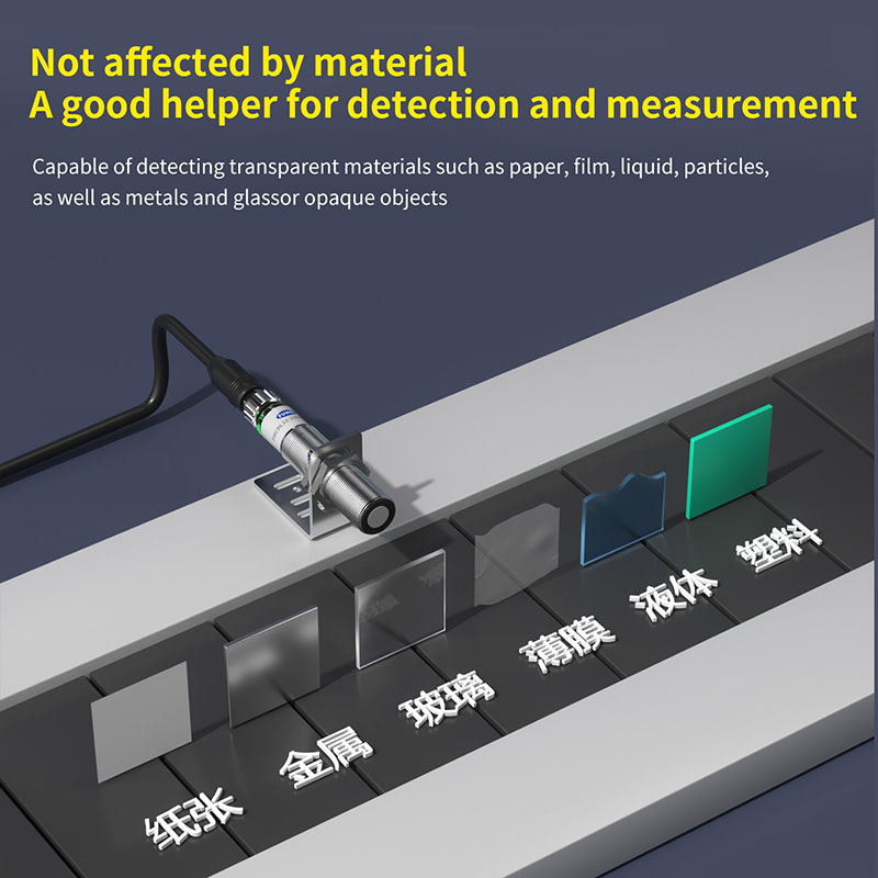 Với độ chính xác cao với độ phân giải 0,5mm và góc phát xạ hẹp ±7°, nó đảm bảo độ chính xác đo cực cao và khả năng chống nhiễu tuyệt vời. Bất kể bề mặt mục tiêu—hấp thụ ánh sáng, phản chiếu hay trong suốt—nó mang lại hiệu suất ổn định, hoàn toàn không bị ảnh hưởng bởi vật liệu hoặc màu sắc của vật thể được phát hiện.
