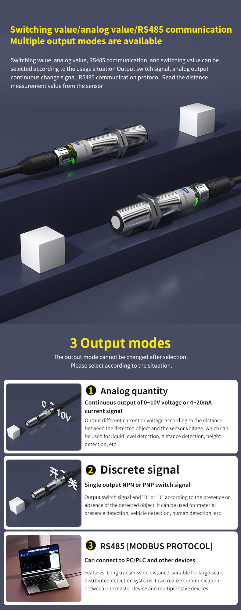 Trong các ứng dụng công nghiệp phức tạp, phép đo chính xác và đáng tin cậy là nền tảng của tự động hóa hiệu quả. Cảm biến khoảng cách siêu âm Fuwei kết hợp giao tiếp Analog, Switch và RS485 thành một thiết bị duy nhất, cung cấp các tùy chọn đầu ra linh hoạt và đa dạng để dễ dàng tích hợp với các hệ thống điều khiển khác nhau.