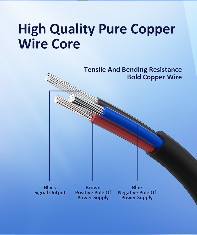 Độ ổn định vượt trội và độ tin cậy cao: Chúng tôi hiểu thực tế khắc nghiệt của môi trường công nghiệp—rung động, ô nhiễm dầu và biến động nhiệt độ là điều bình thường. Sê-ri FSNS18-10 sử dụng các thành phần chất lượng cao và thiết kế mạch tiên tiến để đảm bảo hiệu suất không bị suy giảm trong quá trình hoạt động liên tục ở cường độ cao. Cho dù phải đối mặt với sự rung động liên tục của máy dệt hay nhiệt độ cao và sương mù dầu của xưởng máy công cụ, nó vẫn hoạt động ổn định, cung cấp đầu ra ổn định và hiệu suất cao để đảm bảo dây chuyền sản xuất của bạn hoạt động liên tục.1.3. Thiết kế khéo léo, bền bỉ và lâu dài Lõi dây đồng nguyên chất có độ bền cao: Chúng tôi tin chắc rằng chất lượng bên trong quyết định tuổi thọ của sản phẩm. Cáp cảm biến sử dụng lõi dây đồng nguyên chất chất lượng cao, mang lại độ dẫn điện tuyệt vời và độ suy hao tín hiệu khi truyền tải thấp hơn. Đồng thời, lõi đồng nguyên chất giúp cáp có khả năng chịu kéo và uốn đặc biệt. Ngay cả sau khi kéo hoặc uốn nhiều lần, nó vẫn ngăn ngừa đứt gãy bên trong một cách hiệu quả, kéo dài đáng kể tuổi thọ sử dụng trong các ứng dụng động và giảm thiểu thời gian ngừng hoạt động do hư hỏng cáp.